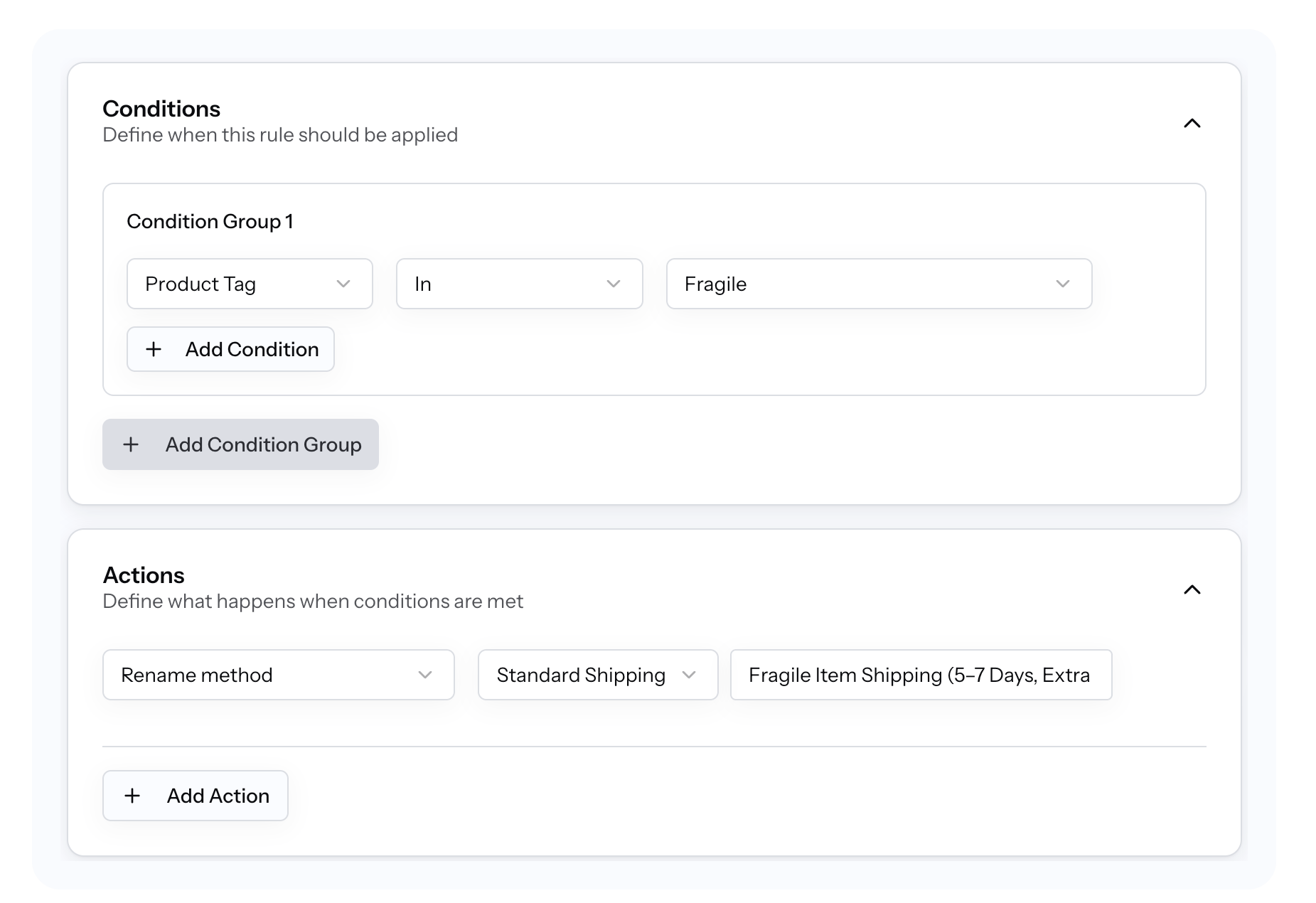 When a customer adds a product tagged as fragile RuleHook intercepts the shipping calculation and dynamically renames the method in real time. No duplicate shipping methods. No extra zones.