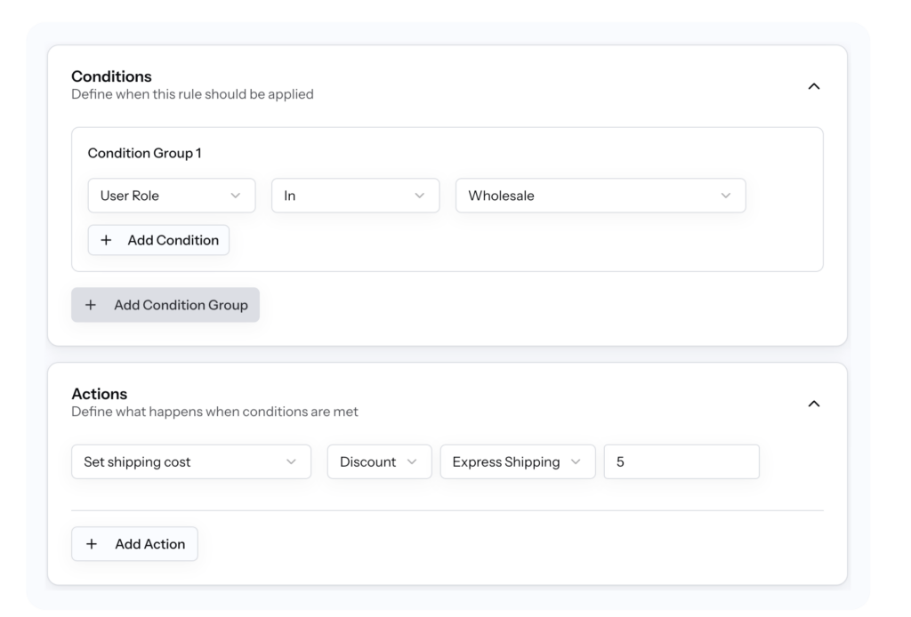 Wholesale and retail customers have different expectations. Showing them the same shipping options is lazy and expensive. With RuleHook, shipping finally adapts to who is buying, not just what they’re buying. Cleaner checkout. Fewer support tickets. Better margins.